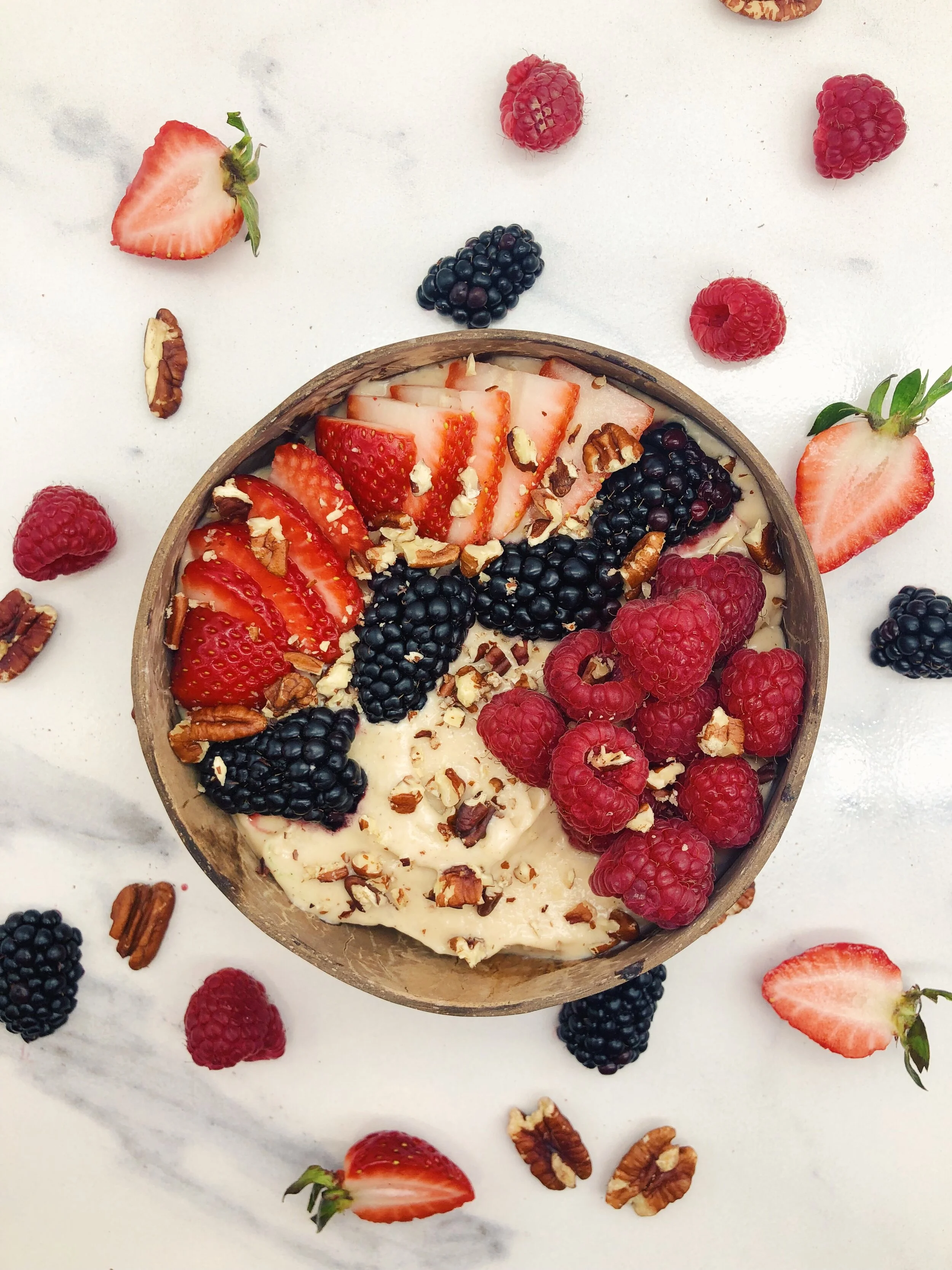 Mix smoothie ingredients in a high speed blender. Add as much milk as needed to blend, but not too much to make it a drink.